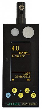 Measures and displays Infrared heat radiation ( W/M² or BTU/Hr/FT² ), visible light ( Lux or Foot candles ), UV light ( mW/M² and µW/lumen ), temperature ( °C or °F ). Similar to 764 but infrared instead of humidity.