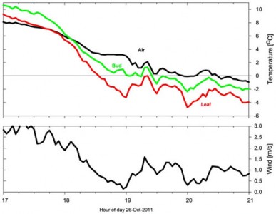 On clear, calm nights, leaf and bud temperature can drop below freezing even if air temperature remains slightly above 0 °C. This is called a radiation frost and is due to the lack of air mixing (wind) near the surface, and a negative net longwave radiation balance at the surface (more longwave radiation is being emitted from the surface than what the surface is absorbing from the clear sky). Under cloudy and/or windy conditions, radiation frost events do not occur.